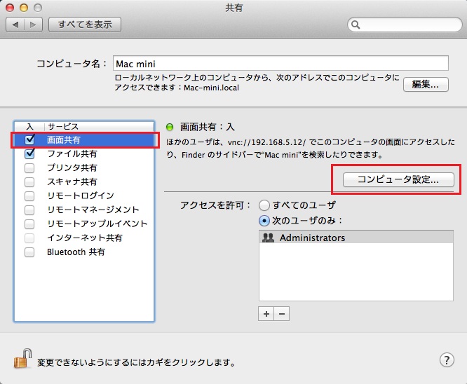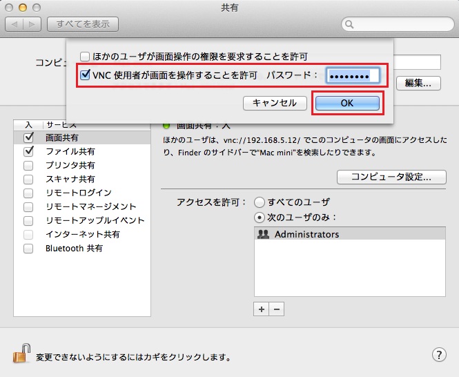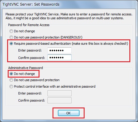 「Password for Remote Access」の欄の「Require password-based authentication (make sure this box is always checked!)」を選択し、Alritのテレワーク画面で設定したパスワードを入力してください。また、「Administrative Password」の欄は「Do not change」を選択してください。入力が完了したら「OK」をクリックしてください。
