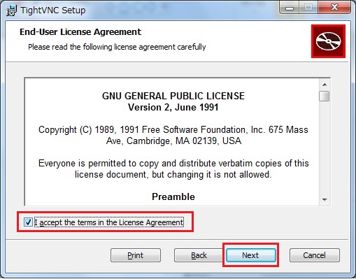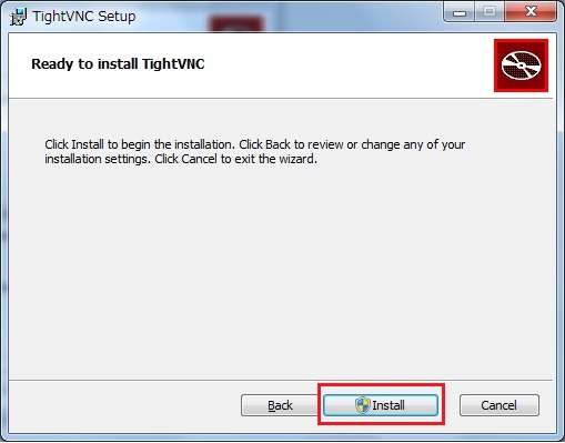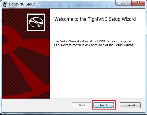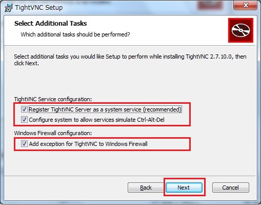 「Register TightVNC Server as a system service (recommended)」「Configure system to allow services simulate Ctrl-Alt-Del」「Add exception for TightVNC to Windows Firewall」にチェックし、「Next」をクリックしてください。