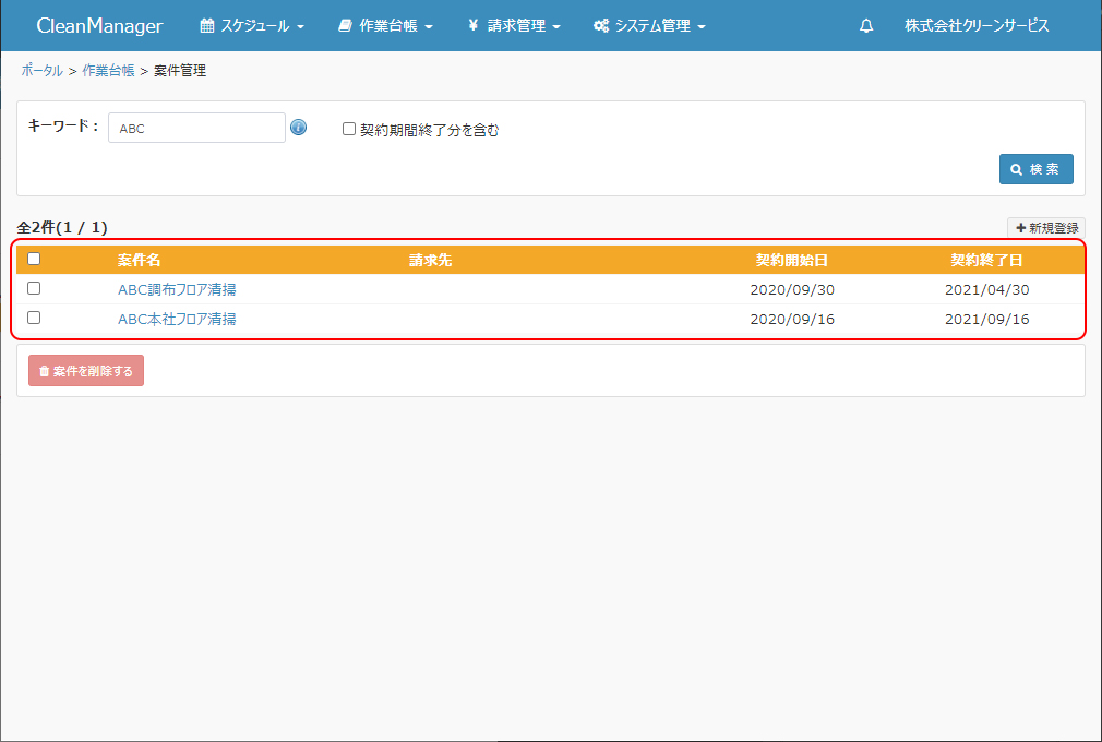 ② ①で指定した検索条件に合致した案件情報が一覧表示されます。