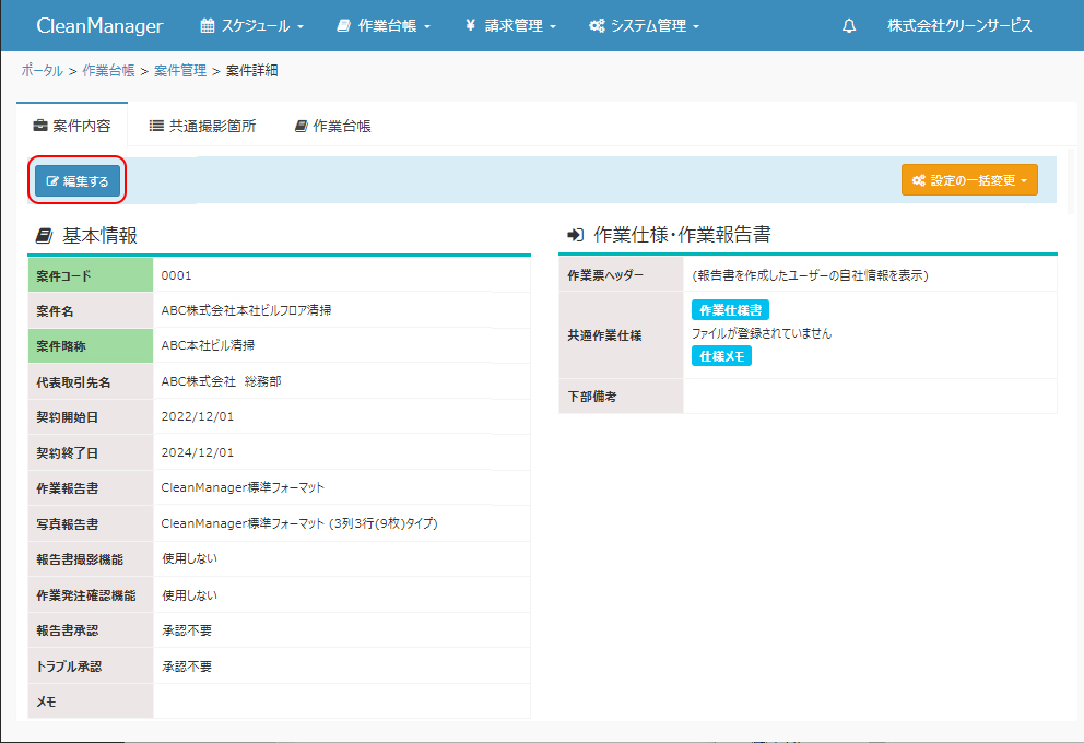 ②選択した案件の登録内容が表示されます。「編集する」ボタンをクリックします。 |