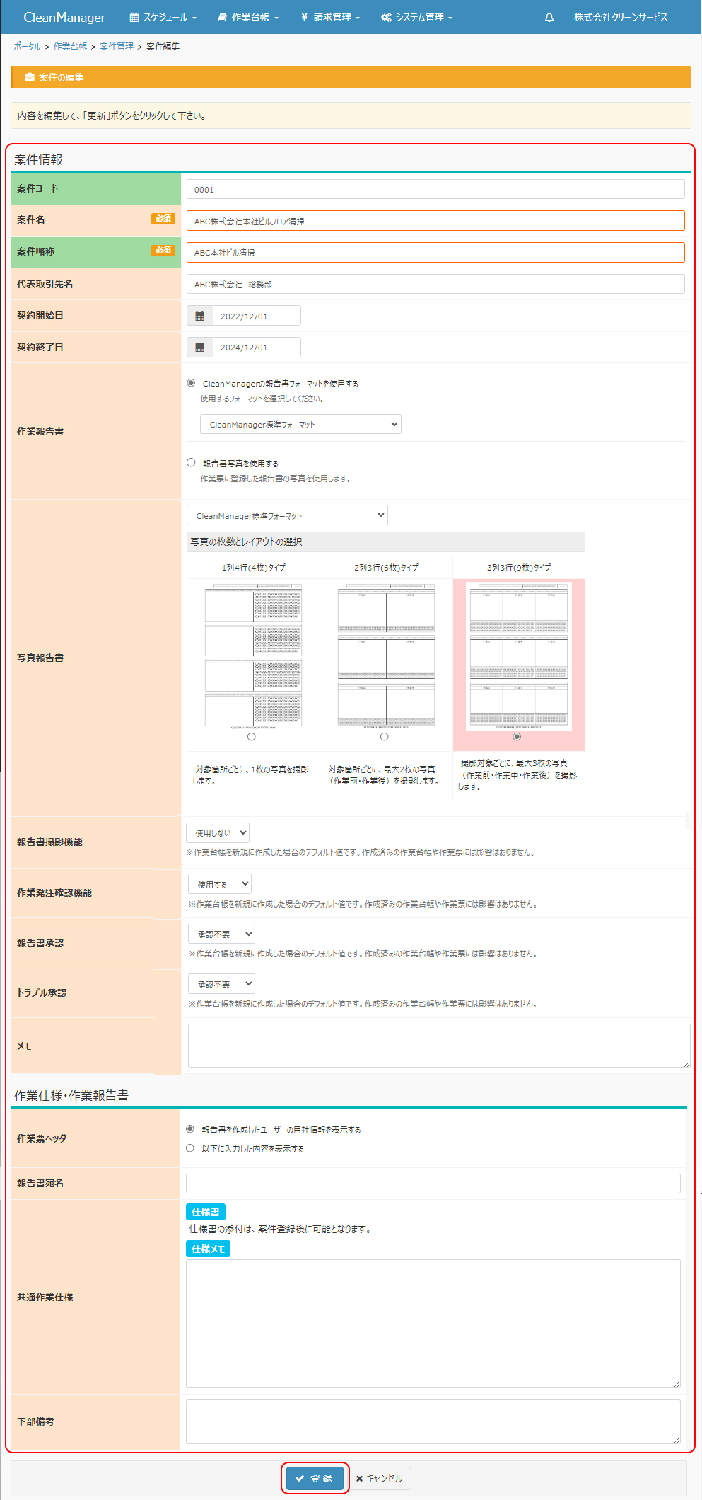 ※共通撮影箇所追加フォームは③の案件情報編集時に「写真報告書」欄にて選択した列タイプによって表示される画面の内容・行数等が変わります。下記は「写真報告書」欄にて3列3行(9枚)タイプを選択した場合の画面となります。 |