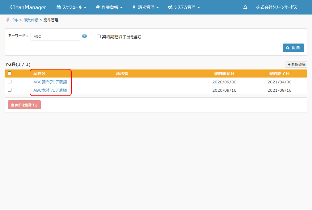 ①案件管理画面にて更新したい案件名をクリックします。 |