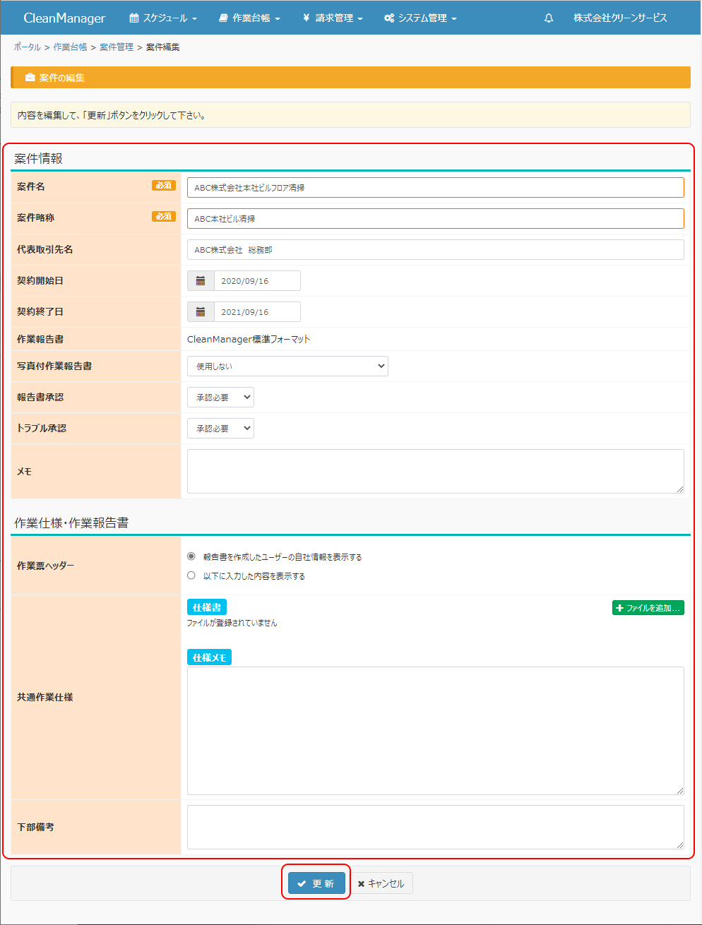 ③案件情報の編集画面が表示されます。任意の項目の内容を編集し、「更新」ボタンをクリックします。