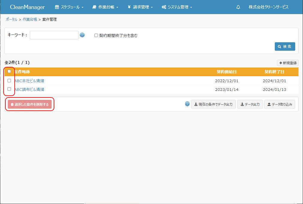 案件一覧から削除を行う場合 ①案件管理画面にて削除したい案件にチェックして「選択した案件を削除」ボタンをクリックします。(複数選択可) |