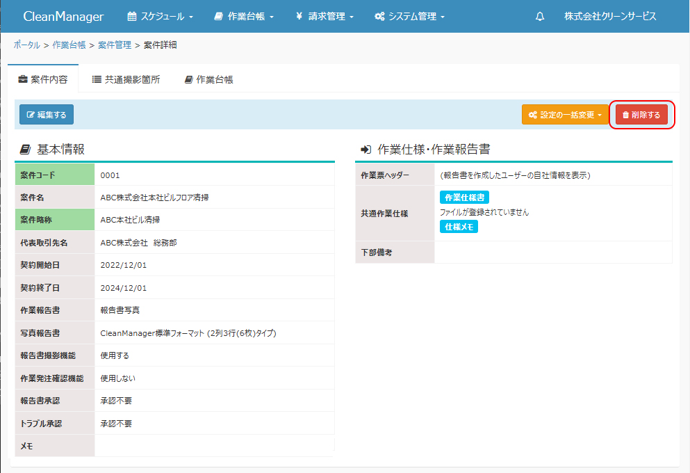 ②選択した案件の登録内容が表示されます。「削除する」ボタンをクリックします。 | |
