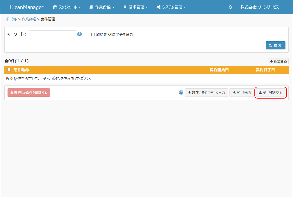 ②案件管理画面にて「データ取り込み」ボタンをクリックします。 |