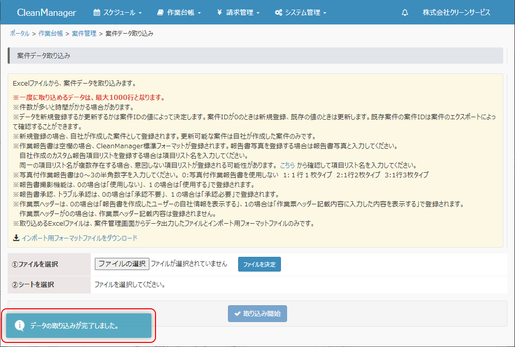 ⑤データの取り込み完了のメッセージが表示されます。これで、選択したExcelシート内の案件データが一括登録されました。 |
