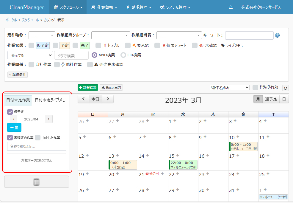 カレンダー画面左の日付未定の作業欄には作業日が設定されていない仮予定、作業予定日時が設定されていない予定状態の作業票、日付未定で登録されたライブメモが表示されます。