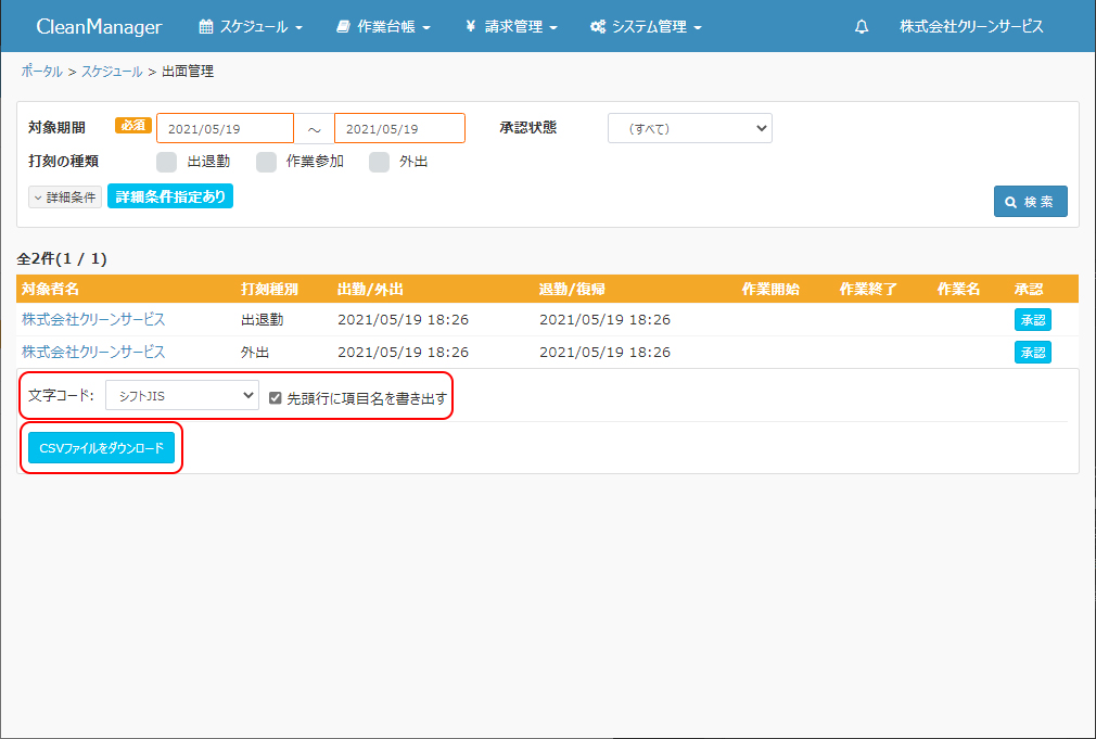 ①出面管理画面にて、検索結果が表示された状態で出力するCSVファイルの出力条件を指定し、「CSVファイルをダウンロード」ボタンをクリックします。 | |