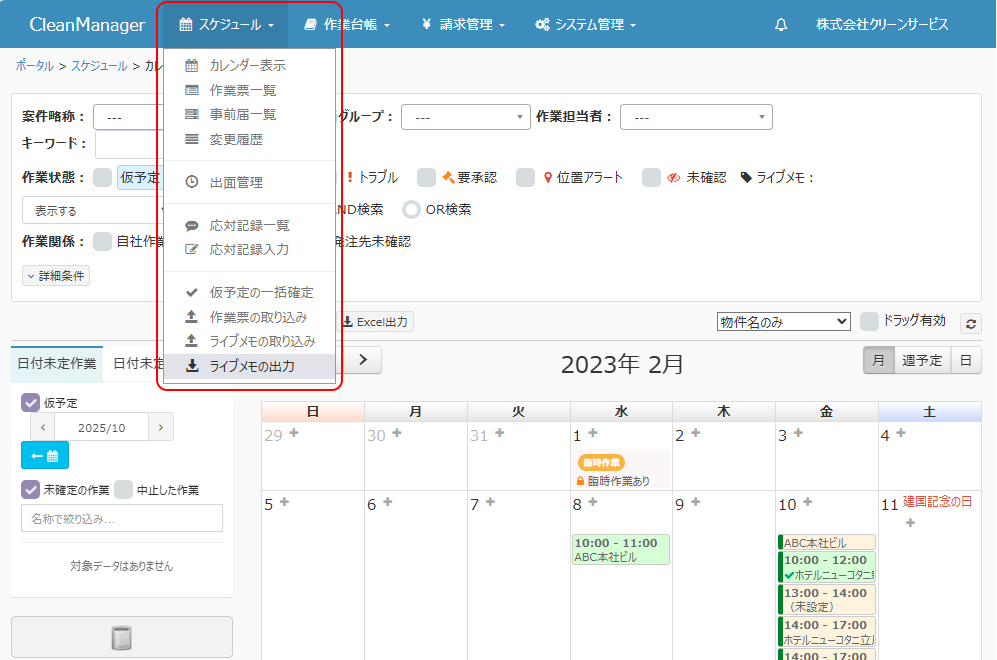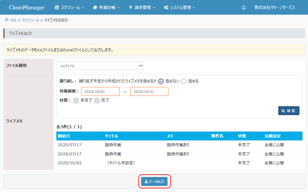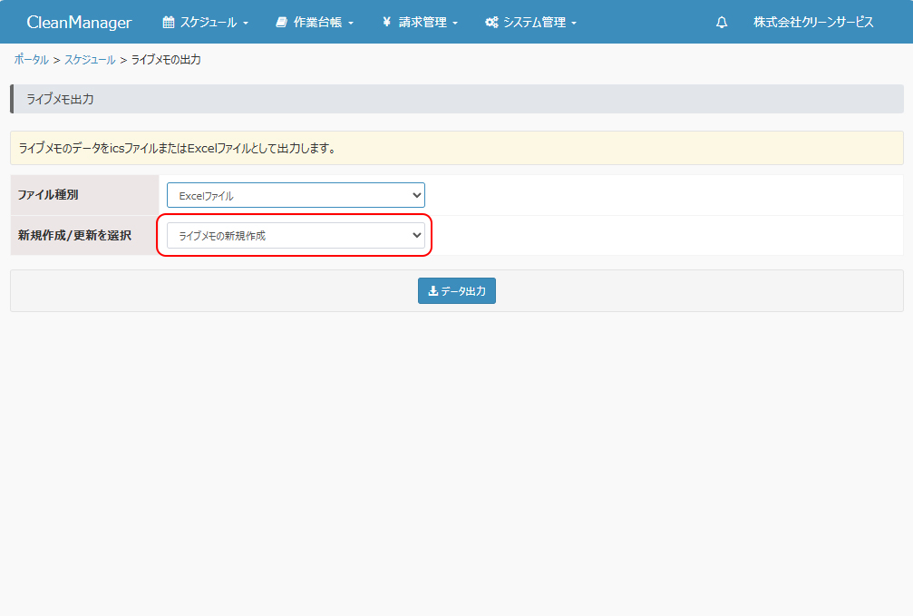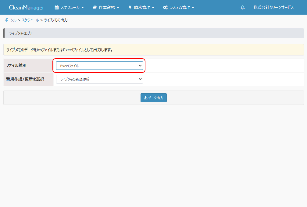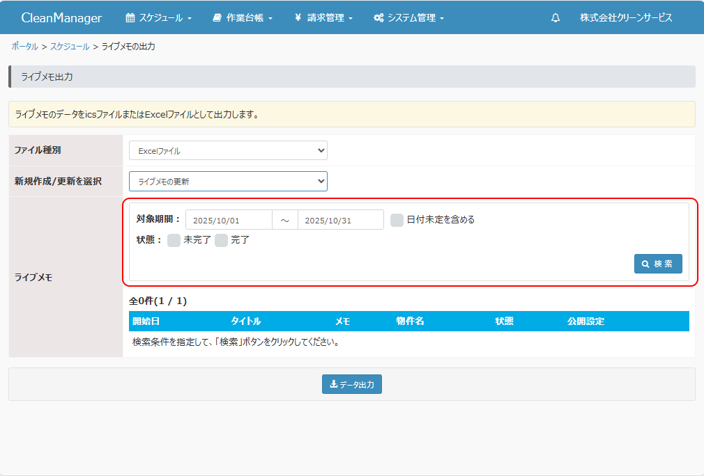 登録済みのライブメモの内容を出力します。本機能にて出力したExcelファイルを元にライブメモを新規登録・更新したり、icsファイルを元にご利用中のカレンダーアプリ等へ移行することができます。 ①メニューより「スケジュール」→「ライブメモの出力」を選択します。 |