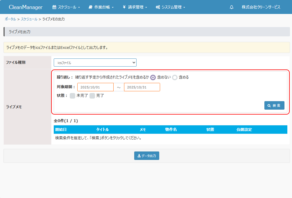 ⑤ ②にて「icsファイル」を選択した場合、ライブメモの出力条件の指定フォームが表示されます。ライブメモの出力条件を指定して「検索」ボタンをクリックすると、出力条件に応じたライブメモが一覧表示されます。 | ||