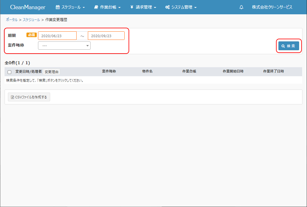 期間:作業日が指定された期間内に該当する作業スケジュールが検索対象となります。(変更前、変更後のいずれの日時も検索対象となります。)