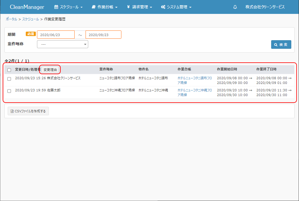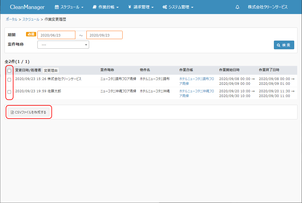 ③作業予定の変更履歴一覧をCSV形式で出力したい場合には、変更履歴を出力したい行にチェックし、「CSVファイルを作成する」ボタンをクリックします。