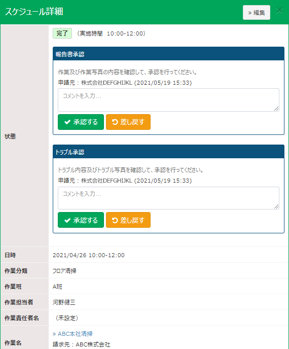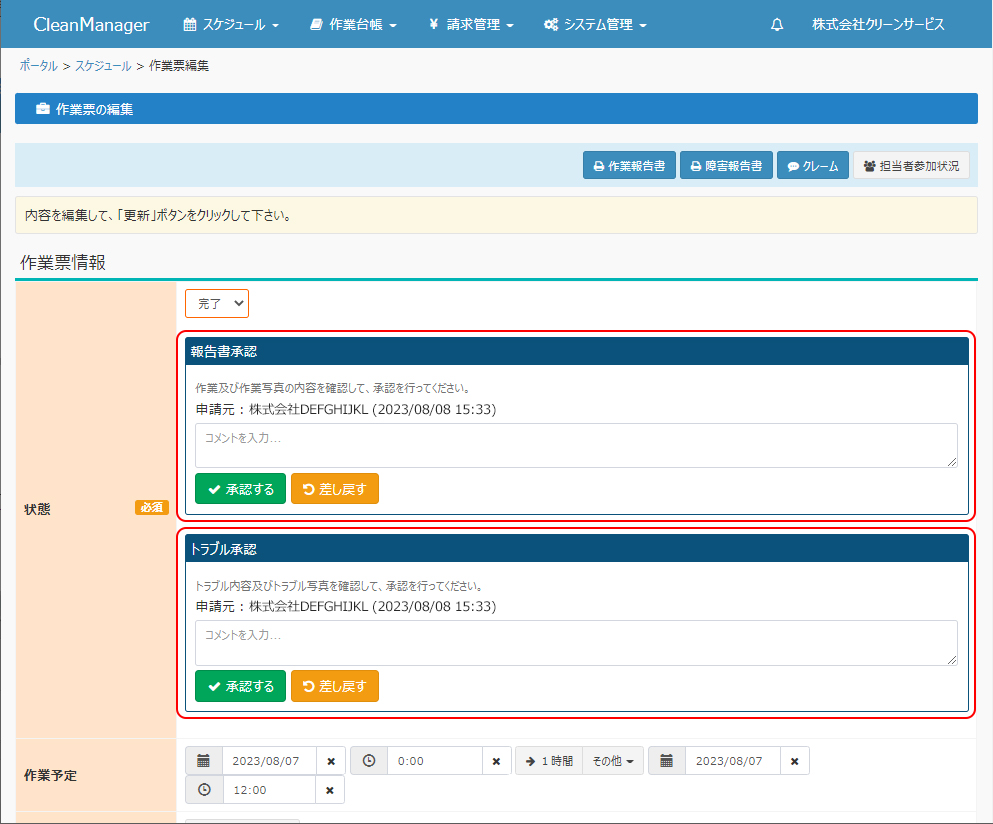 ②表示されたスケジュール詳細、もしくは作業票の編集画面の状態欄内に報告書承認、ならびにトラブル承認欄が表示されます。必要に応じてコメント(承認、差戻の理由など)を入力し、「承認する」ボタン、もしくは「差し戻す」ボタンをクリックします。 ※案件・作業台帳で、「トラブル承認」の設定が「承認必要」となっている場合でも、作業完了時にトラブルありとして登録されていない場合には承認が省略され、トラブル承認欄が表示されません。 ただし、作業完了後に「トラブルあり」となった場合には、トラブルありと更新した階層以上では省略が取り消されて承認が必要な状態に戻り、トラブル承認欄が表示されるようになります。 (例えば、発注元(作業担当会社より上位の階層)がトラブルありに更新した場合は、その階層以上のみで承認が必要となります。) |