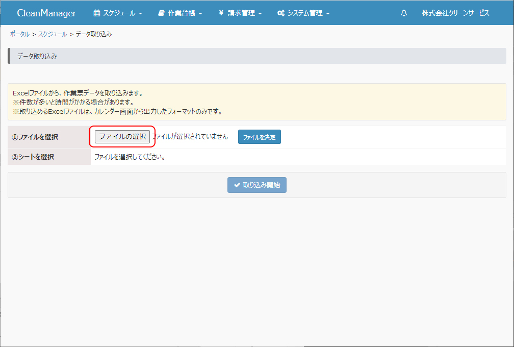 ②メニューより「スケジュール」→「作業票の取り込み」を選択します。 |