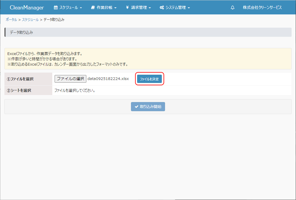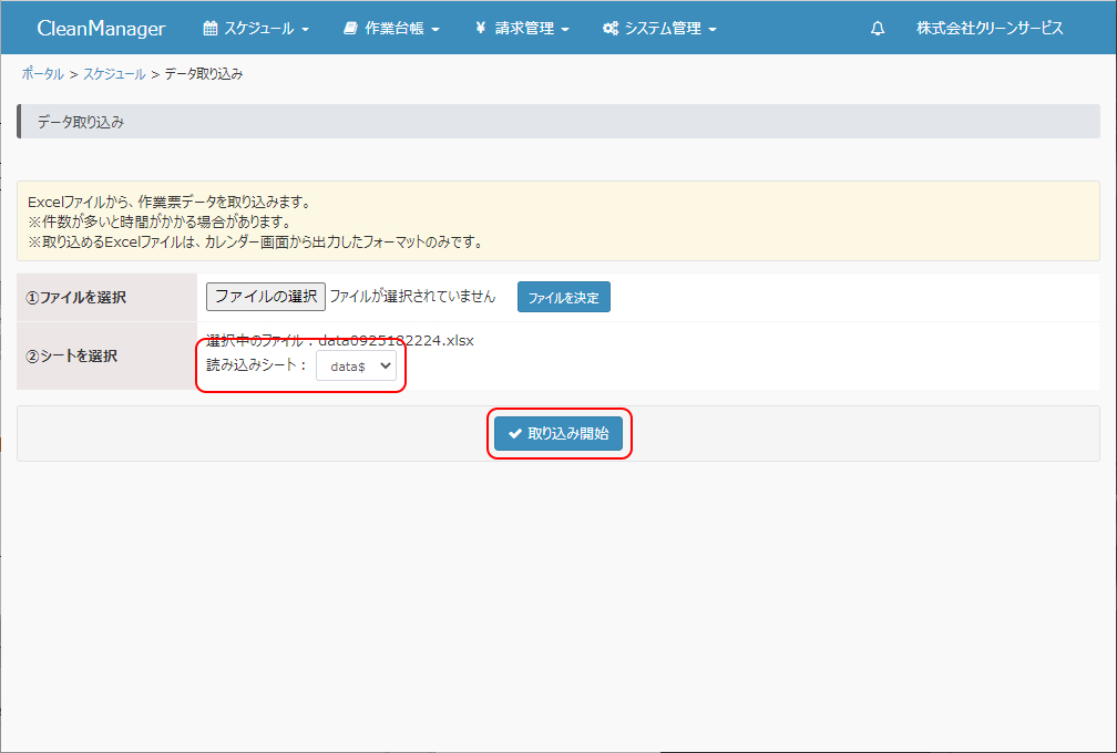 ⑤Excelファイル内にあるシートより今回読み込むシート名を選択し、「取り込み開始」ボタンをクリックします。 |