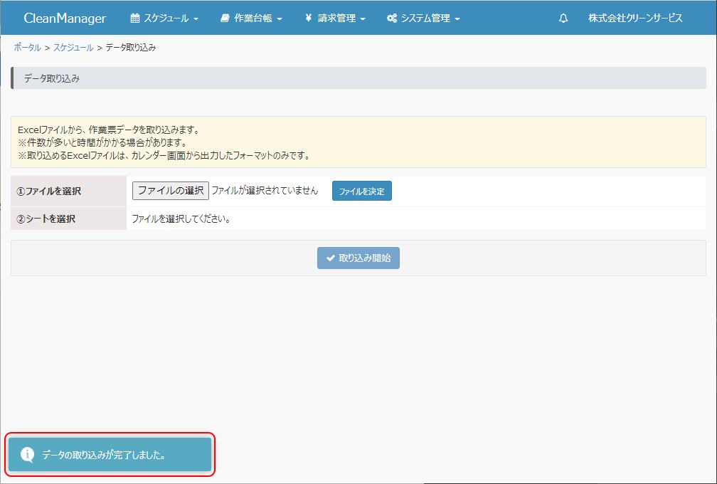 ⑥データの取り込み完了のメッセージが表示されます。これで、Excel内で指定された作業スケジュールが一括登録されました。 |
