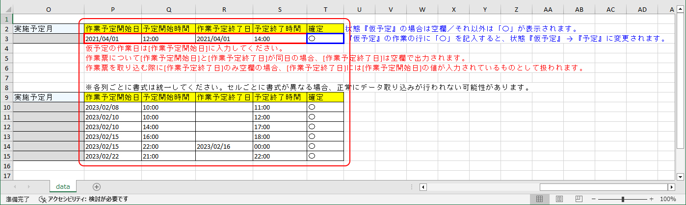 ※作業予定について作業予定終了日のみ空欄の場合、作業予定終了日には作業予定開始日の値が記入されているものとして取り込み処理が行われます。