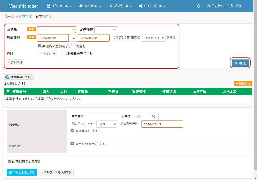 ①請求書発行画面にて発行したい請求データを検索します。検索条件を指定して「検索」ボタンをクリックします。