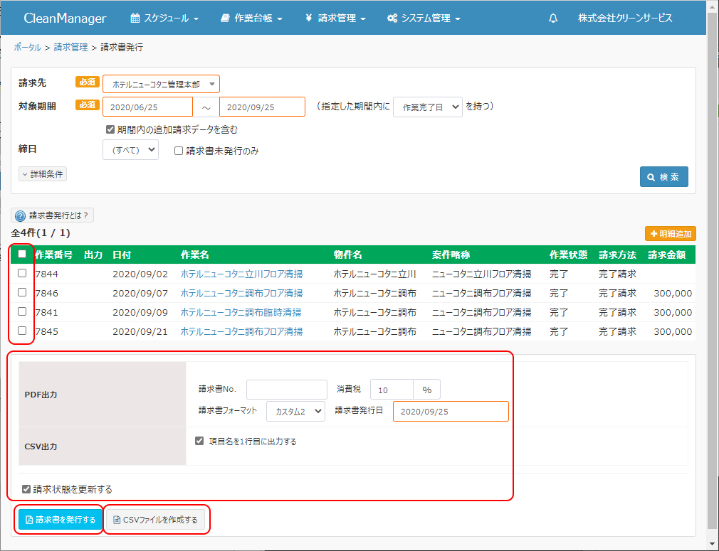 ②検索条件に該当する請求データが一覧表示されます。請求書として発行したい請求データをチェックし、PDF出力もしくはCSV出力の各項目を指定後、いずれかのボタンをクリックしてください。