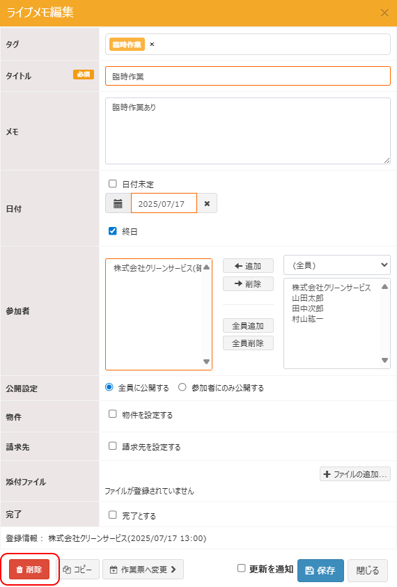 ①カレンダー画面から削除したいライブメモ編集画面を開きます。