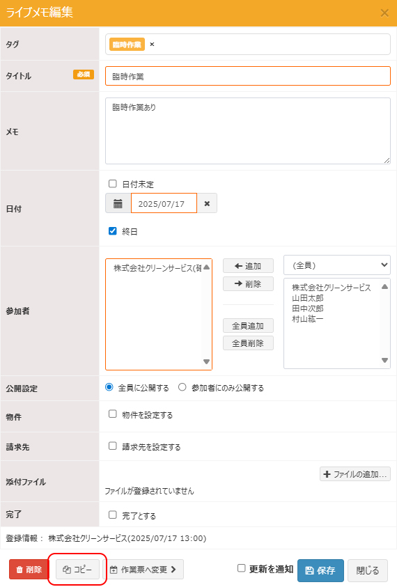登録済みのライブメモの内容をコピーして新規のライブメモを作成します。 |