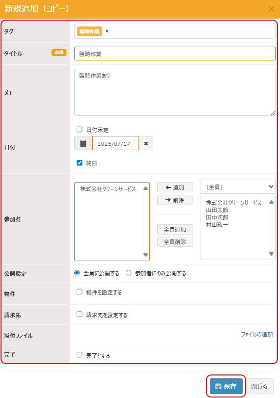④ ①で選択されたライブメモを元にした新規追加(コピー)画面が表示されます。必要に応じて各項目を編集し、保存ボタンをクリックします。 |