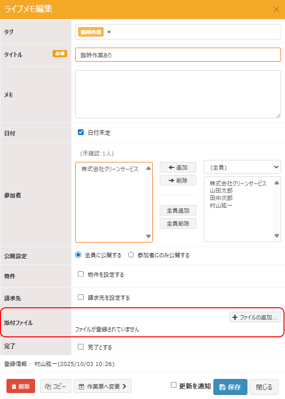 ⑤ライブメモが登録されました。ライブメモの登録後はメモの内容に関連するファイルの添付が可能となりますので、必要に応じて添付ファイルの登録を行ってください。 |