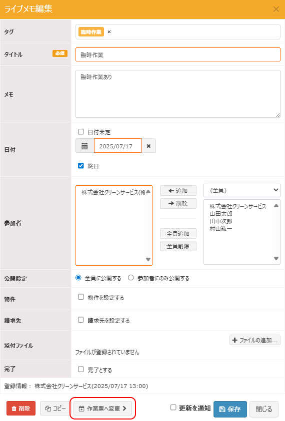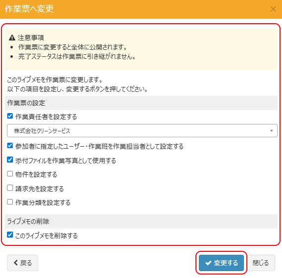 登録済みのライブメモを作業票に変更します。報告書や請求書の発行など、ライブメモではできない操作をしたい場合にライブメモから作業票に変更することでこれらに対応することが可能となります。 |