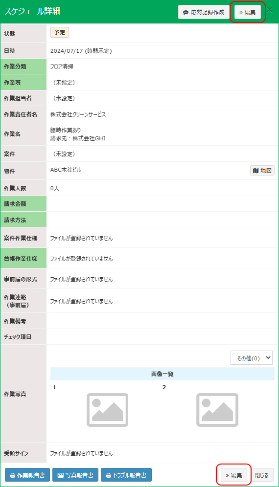 ④ ①で選択されたライブメモを元に新規作成された作業票の詳細画面が表示されます。新規作成された作業票に対してさらに編集が必要な場合には、「編集」ボタンをクリックし、作業票の編集の②以降の手順に従って編集を行ってください。 |