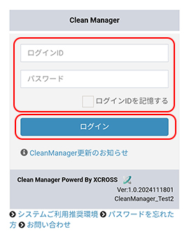 ※ログインID、ならびに初期パスワードはユーザーマスタにて設定されたものとなります。詳しくは自社のCleanManager管理担当者様にお問い合わせください。
