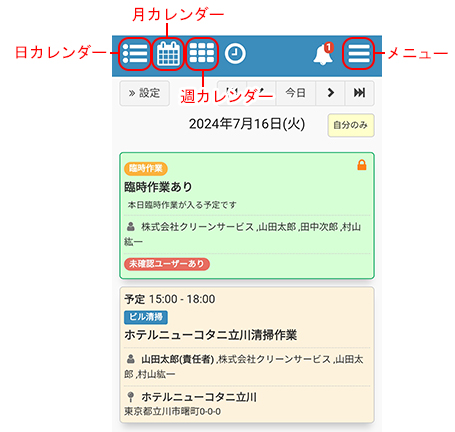 カレンダー表示には日カレンダー画面、月カレンダー画面、週カレンダー画面の3種類があり、ログイン直後は日カレンダー画面が表示されます。それぞれに対応したアイコンをタップ、もしくはメニューより画面名を選択することで各画面が表示されます。