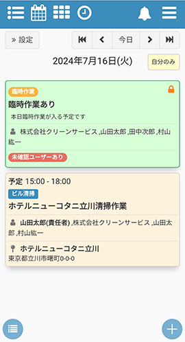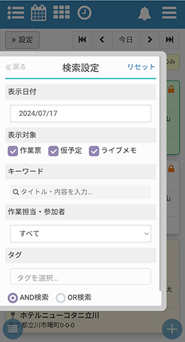 作業票/仮予定/ライブメモ:日カレンダー画面内に指定された条件に合う作業票/仮予定/ライブメモが表示されます。各項目をタップすると、それぞれの内容に対応した画面へ移動します。