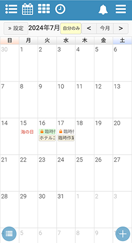 月カレンダー画面では選択した月内の作業班やユーザーの作業票/仮予定/ライブメモが表示されます。 |
