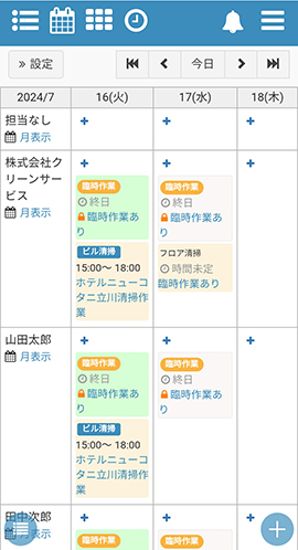 日カレンダー画面では選択した期日内の作業班やユーザーの作業票/仮予定/ライブメモが表示されます。 |