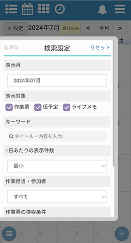 「設定」ボタン:タップすると検索設定画面が表示され、条件を指定することにより日カレンダー画面に表示される内容を絞り込み表示することができます。