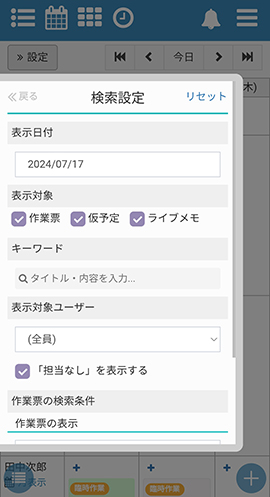 「表示対象」ボタン:タップすると作業班とユーザーの選択画面が表示され、選択した作業班またはユーザーに関連する作業票ならびにライブメモが表示されます。「設定」ボタン内の「作業担当・参加者」と同じ機能になります。