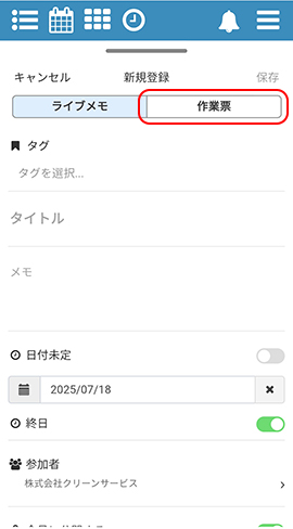 ②新規登録画面が表示されます。「作業票」ボタンをタップします。 |