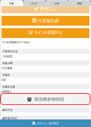 ①作業票画面にて「担当者参加状況」ボタンをタップします。 | |