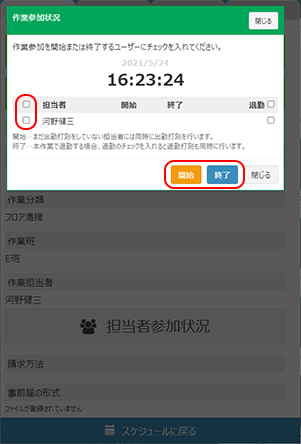 ②作業参加状況画面が表示されます。作業に中途参加する場合には作業参加を開始するユーザー行にチェックし、「開始」ボタンをタップします。 また、作業の中途で離脱する場合には、離脱するユーザー行にチェックし、「終了」ボタンをタップします。