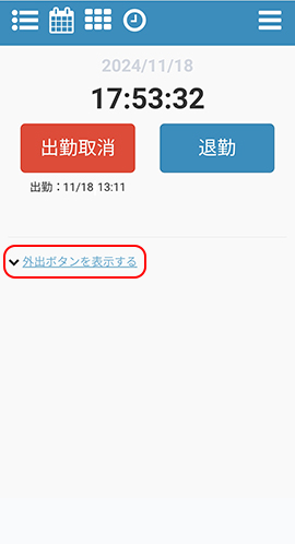 ②打刻画面が表示されます。「外出ボタンを表示する」をタップします。 | |