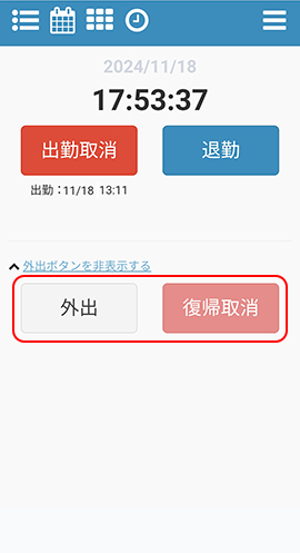 ③外出用の打刻ボタンが表示されます。外出時には「外出」ボタンを、社内への復帰時には「復帰」ボタンをタップします。