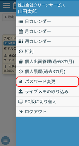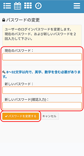 メニューより「パスワード変更」をタップすると、パスワード変更画面が表示されます。ここではログインユーザーのログインパスワードを変更することができます。各項目に入力後、「パスワードを変更する」ボタンをタップしてください。 |