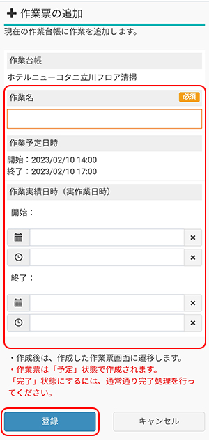 ③作業票の追加画面が表示されます。各項目に入力し、「登録」ボタンをタップします。 | |