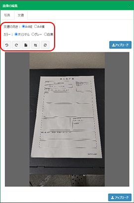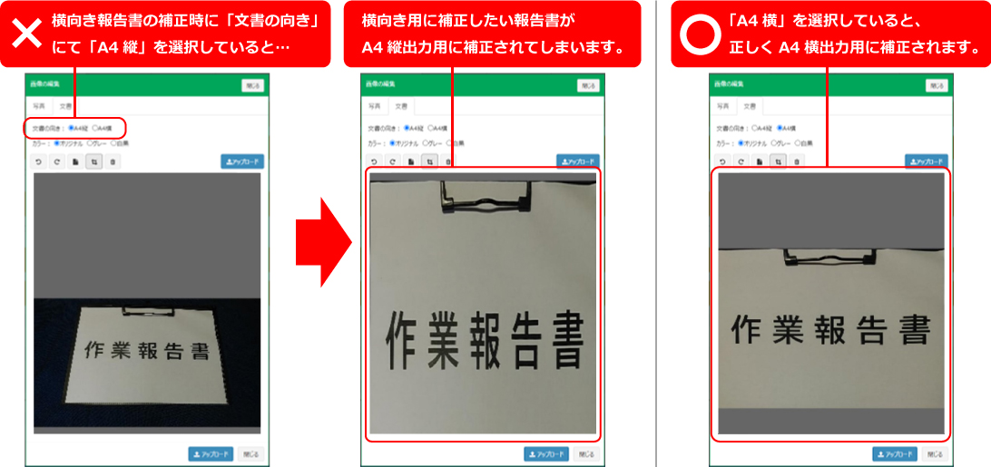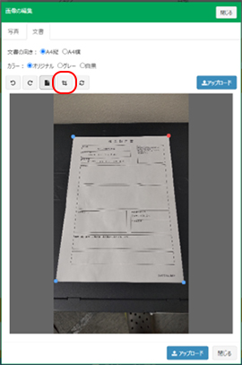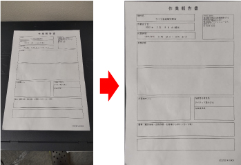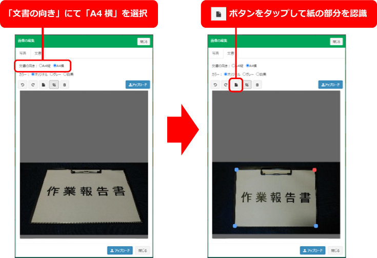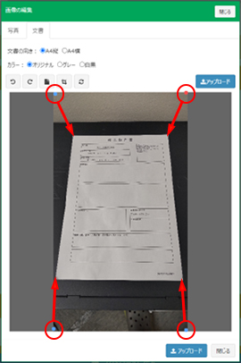 作業票の登録時に報告書写真をアップロードする際に画像の台形補正(傾き補正)を行うことができます。 |