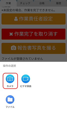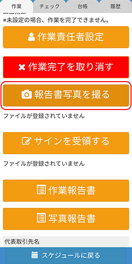 ①作業票画面にて「報告書写真を撮る」ボタンをタップします。 ※「報告書写真を撮る」ボタンは案件の登録時、ならびに作業台帳の登録時に報告書撮影機能を使用する設定になっている作業の場合のみ表示されます。また、案件側と作業台帳側で異なる設定がされている場合(案件側で「使用する」が選択され、作業台帳側で「使用しない」と設定されている場合等)は作業台帳側の設定が優先されます。 |