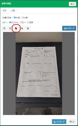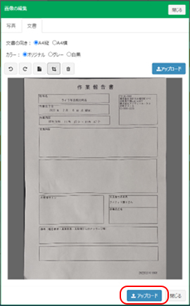 ⑦画像が補正されます。問題がなければ「アップロード」ボタンをタップして報告書写真をアップロードしてください。 | |