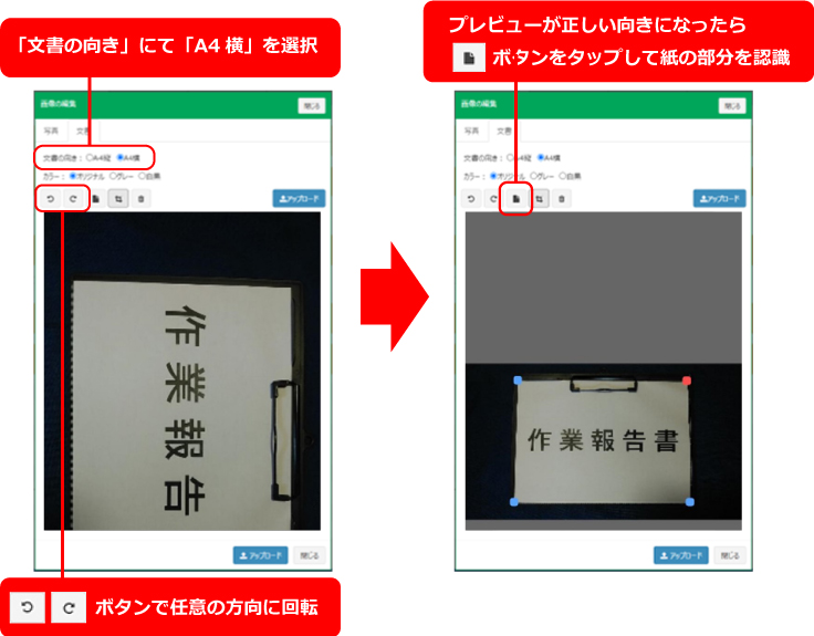 A4横向き報告書登録時の注意点について A4横向き報告書を登録する際には、プレビュー表示の初期状態により以下の手順を行ってください。 ・プレビューが縦向きに表示されている場合 プレビュー内にて下図のように報告書が縦向きに表示されている場合には、手順③~④の時点にて「文書の向き」にてA4横を選択し、正しい向きに回転したうえで紙の部分を認識し、⑤以降の手順に進んでください。 |