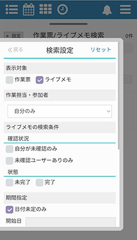 □日付未定のみ:チェックすると日付未定状態の作業票/ライブメモが表示されます。