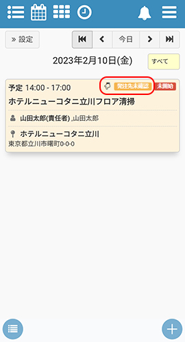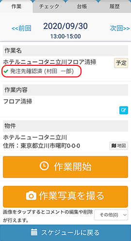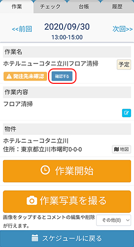 発注先による確認 発注先のユーザーのうち、ユーザーマスタにてシステム管理者または管理者として指定されているユーザー、ならびに作業票にて作業責任者または作業担当者として指定されているユーザーが当該作業票の作業票画面を表示した際に、「確認する」ボタンが表示されます。「確認する」ボタンをタップすると、当該作業票が「発注先確認済」状態となります。 ※「確認する」ボタンのタップ後、取消を行うことは出来ません。ただし、PC版で日付変更を伴う操作が行われた場合、「発注先未確認」の状態に戻る場合があります。 |